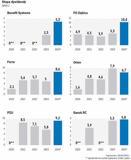 O swoich akcjonariuszach nie zapomniała także inna licząca się spółka Skarbu Państwa, jaką jest Orlen, choć w tym roku musieli oni nieco poskromić swoje apetyty. Do podziału trafi ok. 4,8 mld zł, co oznacza 4,15 zł na akcję. Z uwagi na zaplanowane inwestycje wypłata będzie niższa niż przed rokiem, gdy spółka przekazała akcjonariuszom po 5,50 zł. Mimo to będzie to druga najwyższa dywidenda w 12-letniej historii wypłat płockiego koncernu. Termin, którego nie można przegapić, chcąc skorzystać z prawa do udziału w zyskach, to 20 września.