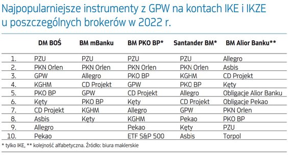 Okazuje się, że najpopularniejszym papierem z GPW wybieranym w ramach indywidualnych kont emerytalnych oraz indywidualnych kont zabezpieczenia emerytalnego w 2022 r. były akcje PZU. Pojawiły się na rachunkach u największej liczby klientów w DM BOŚ, BM mBanku, BM PKO BP oraz Santander BM. Znalazły się także w pierwszej dziesiątce najpopularniejszych instrumentów w BM Alior Banku (ten broker nie podaje szczegółowej kolejności).