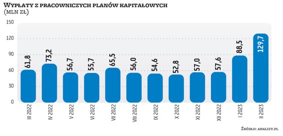 W lutym fundusze PPK pozyskały około 330 mln zł netto, czyli najmniej od dwóch lat, i to mimo że w tym czasie wzrosła liczba uczestników programu – wyliczył serwis analizy.pl. To efekt znacząco wyższych wypłat z programów. Według szacunków uczestnicy PPK wypłacili w lutym około 130 mln zł po tym, jak w lutym wypłaty wyniosły 88,5 mln zł. Wcześniej ich poziom kształtował się nieco powyżej 50 mln zł. Z nieoficjalnych szacunków wynika, że w marcu jest podobnie.