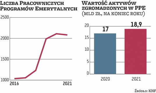 Utworzenie w firmie pracowniczych programów emerytalnych zwalniało ją z obowiązku uruchamiania pracowniczych planów kapitałowych. Są jednak warunki: do PPE musi należeć co najmniej 25 proc. załogi, a składka, którą pracodawca wpłaca na konto pracownika w PPE, nie może być niższa niż 3,5 proc. jego pensji brutto. Mimo podobieństwa obu programów wiele firm oceniło, że bardziej opłaca im się udostępnienie pracownikom PPE. I dlatego od momentu startu programu PPK mocno zaczęła rosnąć liczba PPE. Opłacało się to zwłaszcza w dużych firmach, dlatego największe przyrosty PPE miały miejsce w pierwszym okresie wdrażania pracowniczych planów kapitałowych, bo to wtedy przystępowały do nich właśnie te większe firmy. W efekcie, podczas gdy na koniec 2016 r. działających PPE było 1036, to na koniec 2020 i 2021 r. liczba znacząco przekraczała granicę 2000.