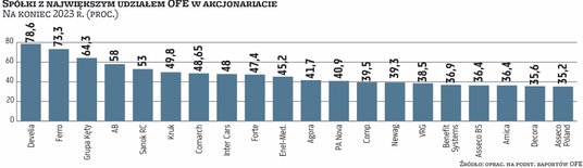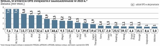 Według wyliczeń serwisu analizy.pl z końcem zeszłego roku aktywa OFE przekroczyły rekordowe 208 mld zł, z czego ok. 188 mld zł ulokowane było w polskich i zagranicznych akcjach, co oznacza, że stanowiły one ponad 90 proc. portfeli funduszy. Z tego wartość portfela krajowych spółek wynosiła prawie 160 mld zł, co stanowiło prawie 77 proc. ich aktywów. W skali całego 2023 r. jego wartość zwiększyła się o ponad 36 mld zł. Jednocześnie zarządzający nie stronili od szukania okazji poza polskim rynkiem, inwestując w akcje firm notowanych na zagranicznych parkietach. Walory firm notowane poza rodzimym rynkiem warte były ok. 29 mld zł i odpowiadały za nieco ponad 14 proc. wartości portfela inwestycji OFE wobec 9,5 proc. rok wcześniej. W skali całego minionego roku wartość całego pakietu zagranicznych akcji niemal się podwoiła.