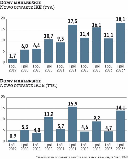 Maklerskie indywidualne konta emerytalne (IKE) i indywidualne konta zabezpieczenia emerytalnego (IKZE) znów na fali wznoszącej. Takie wnioski płyną z danych za II półrocze 2023 r., jakie zebrał „Parkiet” wśród niemal wszystkich biur i domów maklerskich, które mają w swojej ofercie te produkty. W przypadku IKE padł nowy rekord, jeśli chodzi o liczbę nowo otwartych rachunków. IKZE o ten rekord się otarły.