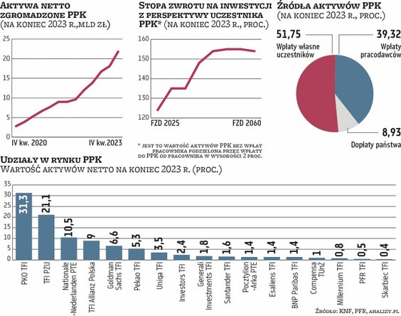 Z punktu widzenia uczestników PPK istotne jest to, że tylko 51,75 proc. (11,25 mld zł) z całej kwoty aktywów pochodzi z ich wpłat własnych. Reszta, czyli blisko 10,5 mld zł, to wpłaty od pracodawców i państwa. Jak informował nas niedawno Bartosz Marczuk, wiceprezes Polskiego Funduszu Rozwoju nadzorującego PPK, zyski wypracowane przez instytucje finansowe zarządzające oszczędnościami uczestników tego programu od początku jego istnienia sięgnęły 3,4 mld zł. Procentowo zarobiły one dla uczestników PPK ponad 31 proc.