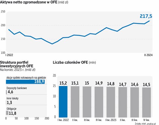 Choć liczba uczestników OFE od dłuższego czasu kurczy się w tempie mniej więcej 100 tys. na kwartał i spadła już głęboko poniżej 15 mln, to wartość aktywów tych funduszy od kilku miesięcy wyraźnie przekracza 200 mld zł, a na koniec lutego sięgnęła 217,5 mld zł.