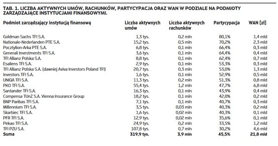 Na koniec 2023 r. program PPK tworzyło 3,39 mln uczestników, dla których założono 3,95 mln rachunków. W programie uczestniczyło wówczas 320 tys. firm, a środki zgromadzone na tych rachunkach urosły do poziomu 21,74 mld złotych. Partycypacja w programie wynosiła 45,56 proc.