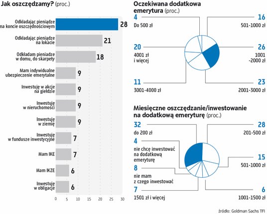 Badanie przeprowadzone na zlecenie Goldman Sachs TFI pokazuje, że wśród osób, które podejmują działania, by w przyszłości mieć dodatkowe środki na życie, 49 proc. oszczędza, 32 proc. inwestuje, a 31 proc. korzysta z produktów emerytalnych. Polacy mają zróżnicowane strategie długoterminowego oszczędzania na „jesień życia”. Jako sposoby gromadzenia środków na dodatkową emeryturę najczęściej wymieniają konto oszczędnościowe (28 proc.), lokatę (21 proc.) i odkładanie pieniędzy „do skarpety” (18 proc.). Wśród jednej trzeciej badanych, którzy jako swój sposób na dodatkową emeryturę wskazują inwestycje, najwięcej inwestuje w nieruchomości, w ziemię i akcje spółek notowanych na giełdzie papierów wartościowych (po 9 proc. odpowiedzi). Nieco rzadziej respondenci inwestują w złoto i fundusze inwestycyjne (po 7 proc.). Osoby, które udzieliły w badaniu takich odpowiedzi, zarabiają powyżej 6 tys. zł miesięcznie i twierdzą, że żyją „bardzo dobrze”. 45 proc. z nich myśli o dodatkowej emeryturze, a 42 proc. ma również produkty emerytalne. Inwestycjami zajmują się głównie mężczyźni, osoby pochodzące z miast od 100 tys. do 500 tys. mieszkańców, z wyższym wykształceniem, prowadzące działalność gospodarczą, zarabiające powyżej 6 tys. zł, które słyszały o uldze na IKZE i korzystają z niej.