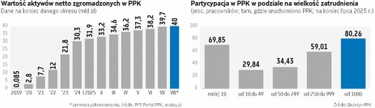 Przypomina, że na koniec 2024 r. w PPK zgromadzonych było 30,24 mld zł. W niespełna osiem miesięcy wartość ta wzrosła więc o 10 mld zł, za sprawą systematycznych wpłat, rosnącej liczby uczestników, korzystnej koniunktury na rynkach finansowych i dobrych efektów zarządzania oszczędnościami przez instytucje finansowe. Liczba uczestników programu wzrosła w tym czasie z 3,69 mln do 3,94 mln osób - o 250 tys. nowych oszczędzających. – Z punktu widzenia uczestnika PPK to prosty i efektywny sposób na budowanie kapitału na przyszłość, oparty na regularnych wpłatach pracownika, pracodawcy i państwa. W skali całej gospodarki 40 mld zł to znaczny kapitał inwestowany m.in. w rozwój polskich przedsiębiorstw, tworzenie miejsc pracy oraz rozwój rynku kapitałowego – czytamy w komunikacie PFR Portal PPK.