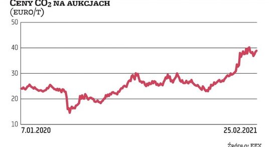 Krajowe koncerny energetyczny będą próbowały przerzucić rosnące koszty na klientów. Widzimy to na Towarowej Giełdzie Energii, gdzie ceny energii rosną w ślad za drożejącymi uprawnieniami do emisji CO2. W lutym ceny energii w kontraktach na przy szły rok sięgnęły nawet 287,60 zł za megawatogodzinę, czyli zaledwie w ciągu miesiąca wzrosły o 14 proc. Mimo to Bartłomiej Kubicki z Societe Generale zakłada ujemne marże na wytwarzaniu czarnej energii w latach 2021–2022, bo jak na razie nie udaje się przełożyć w pełni rosnących kosztów na ceny prądu.