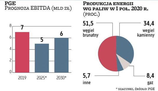 Obecny portfel wytwórczy PGE jest w ponad 80 proc. oparty na węglu kamiennym i brunatnym. Władze spółki liczą na to, że uda się wyłączyć wszystkie aktywa węglowe z grupy i przenieść je do osobnej spółki należącej do Skarbu Państwa. Pozbycie się tego balastu pomoże PGE pozyskać finansowanie dla zielonych inwestycji. Kiedy mogłoby dojść do wydzielenia aktywów? – Termin do końca 2021 r. byłby dla nas najbardziej optymalnym rozwiązaniem – skwitował Wojciech Dąbrowski, prezes PGE. – Jeśli nie wydzielimy aktywów węglowych, to za półtora roku będziemy musieli ogłosić upadłość firmy – dodał.