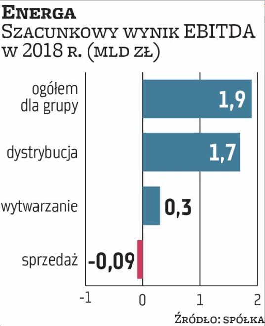 W efekcie szacunkowa EBITDA (wynik operacyjny powiększony o amortyzację) segmentu sprzedaż w samym IV kwartale 2018 r. znajdzie się pod kreską i wyniesie minus 135 mln zł. W całym 2018 r. grupa osiągnie stratę EBITDA w tym obszarze sięgającą 85 mln zł. Wcześniej Energa szacowała, że wynik ten w IV kwartale wyniesie 2 mln zł, a w całym roku 52 mln zł. W sumie, po dokonanym odpisie, szacunkowa EBITDA Energi w IV kwartale wyniosła 290 mln zł, a w całym 2018 r. 1,88 mld zł.