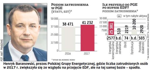Siedmioprocentowy przyrost w największej grupie energetycznej to efekt wzięcia na pokład 3154 pracowników EDF Polska, przejmowanych wraz z kupowanymi w listopadzie 2017 r. elektrowniami i elektrociepłowniami. Na koniec 2017 r. w PGE pracowało 41,23 tys. osób. W poprzednich latach liczba zatrudnionych sukcesywnie spadała. Przykładowo w 2016 r. odchudzono grupę o ok. 400 etatów. – Gdyby nie uwzględniać pracowników EDF, to na koniec 2017 r. byłoby o blisko 400 etatów mniej w grupie. To oznacza spadek liczby zatrudnionych o 1 proc. w stosunku do stanu z końca grudnia 2016 r. – szacuje Maciej Szczepaniuk, rzecznik PGE. Ten spadek to głównie odejścia osób z tzw. spółek pomocniczych, np. dostarczających materiały elektryczne dla oddziałów, świadczących usługi transportowe czy ochroniarskie.
