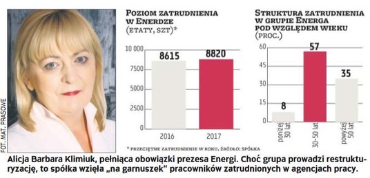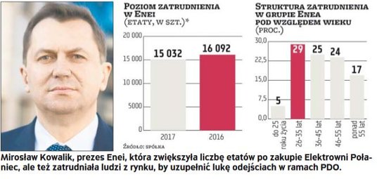 Na pokład Enei trafiło ok. 630 pracowników po przejęciu Połańca i spółki Bioenergia w 2017 r. To większa część z 1060 więcej zatrudnionych na koniec 2017 r. (w stosunku do końca 2016 r.). Byłoby więcej, gdyby nie odejścia 545 pracowników w ramach programu dobrowolnych odejść i ok. 214 osób, które przeszły na emeryturę. Ale warto zauważyć, że Enea także zatrudniła w tym czasie pokaźną grupę ponad 1,53 tys. osób.
