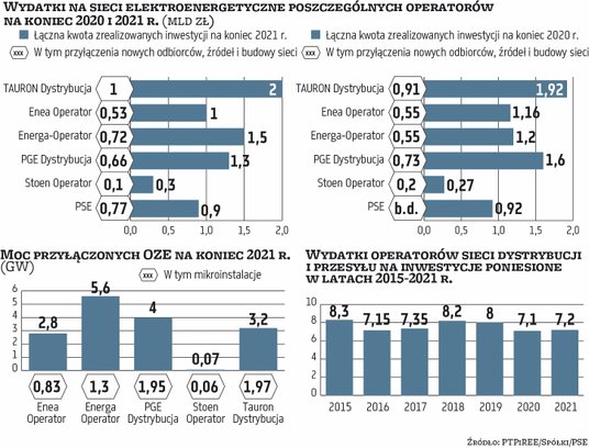 Łączna moc zainstalowana wszystkich źródeł energii elektrycznej w Polsce wyniosła 20,3 GW. W analogicznym okresie roku poprzedniego było to ponad 14,5 GW. Wydatki polskich operatorów na rozwój oraz modernizację sieci są jednak nieproporcjonalne do koniecznego rozwoju odnawialnych źródeł energii, co potwierdza rosnąca liczba odmów przyłączenia do sieci. – W samym 2021 r. operatorzy odmówili przyłączenia do sieci około 15 gigawatów nowych mocy, głównie odnawialnych źródeł energii – mówi Wojciech Modzelewski z organizacji ClientEarth Prawnicy dla Ziemi. Dystrybucyjne spółki jednak tłumaczą się z zarzutów o niedoszacowanie inwestycji.