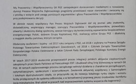 Rada nadzorcza zdecydowała aby prezes Dąbrowski nadal pełnił swoją funkcję. Bezpośrednim powodem odwołania Wojciecha Dąbrowskiego ze stanowiska prezesa Polskiej Grupy Energetycznej miała być ogłoszona ubiegłym tygodniu nowa strategia PGE, w której spółka zadeklarowała odejście od węgla w ciepłownictwie. Sam premier Morawiecki chciał jednak wykorzystać wrogość części górniczych związków zawodowych do prezesa PGE w konflikcie z szefem Ministerstwa Aktywów Państwowych, nadzorującym PGE, Jackiem Sasinen. Ceną za utrzymanie prezesury przez Dąbrowskiego było wstrzymanie realizacji aktualizacji strategii PGE.