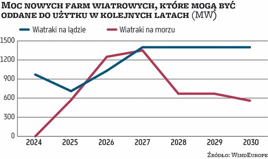 WindEurope podzielił się swoimi szacunkami dotyczącymi przyrostu mocy w kolejnych latach. Na koniec 2023 r. Polska dysponowała według organizacji 9,4 GW łącznej mocy w wietrze na lądzie. W tym roku – wedle prognoz – powstanie ok. 970 MW nowych mocy w nowych farmach wiatrowych. W 2025 r. będzie to ok. 710 MW na lądzie i – wedle szacunków tej organizacji – pierwsze farmy wiatrowe na morzu o mocy 570 MW. W 2026 r. może to być ok. 1030 MW na lądzie i już 1250 MW na morzu. Od 2027 r. do końca 2030 r. WindEurope szacuje stały stopniowy przyrost mocy farm wiatrowych na lądzie rzędu 1400 MW rocznie. Na morzu zaś ma pojawić się 1350 MW mocy w 2027 r., następnie w 2028 r. i w 2029 r. po 670 MW, a w 2030 r. 560 MW. W rezultacie na lądzie pod koniec tej dekady Polska może dysponować mocą wiatraków sięgającą ponad 18,3 GW, a na morzu ponad 5 GW.