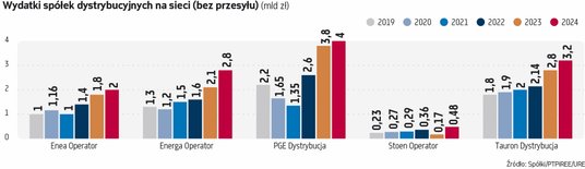 Spółki dystrybucyjne, jako przedsiębiorstwa prowadzące działalność o charakterze regulowanym, mają obowiązek sporządzania i przekładania prezesowi URE planów rozwoju określających kierunki rozwojowe oraz harmonogram ponoszenia nakładów inwestycyjnych oraz wycenę tych inwestycji. Tym samym finansowanie uzgodnionych przez prezesa URE planów rozwoju odbywa się poprzez stawki opłat za usługi dystrybucji energii elektrycznej spółki, które zatwierdzane są co roku przez prezesa URE w taryfie dla usług dystrybucji energii elektrycznej. Aby ułatwić spółkom te inwestycje, zagwarantowano im stabilne finasowanie inwestycji sieciowych poprzez waloryzację wskaźnika uzasadnionego poziomu średnio ważonego kosztu kapitału (WACC) do poziomu 8,5 proc. rocznie, od 2025 r. OSD uzyskali też możliwość podwyższenia zwrotu z zaangażowanego kapitału o dodatkowy 35-proc. zwrot wysokości nakładów inwestycyjnych planowanych oraz uwzględnionych przez prezesa URE w kalkulacji taryfy na dany rok. Prezes URE ma z kolei coraz większy orzech do zgryzienia, aby pozwolić spółkom na zwiększenie opłat dystrybucyjnych przy jednoczesnym łagodzeniu ew. podwyżek cen energii z tego powodu. Na razie to się udaje. Średnioroczne stawki za dystrybucję łącznie na rachunku gospodarstwa domowego rozliczającego się według taryfy G w 2025 r. nie zwiększyły się, a wzrosty średnie stawki dystrybucji, patrząc na innych odbiorców, wahały się (w zależności od operatora) od 0,4 do 3,7 proc. Jednocześnie spółki pozyskują środki finansowe z różnych źródeł przeznaczonych na cele rozwojowe, zwłaszcza o charakterze bezzwrotnych dotacji. Jak zatem idzie spółkom z wydatkowaniem środków?