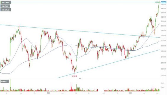 Przez szereg miesięcy WIG-energia poruszał się w trendzie bocznym, zawężając zarówno kolejne szczyty, jak i dołki. Indeks utworzył formację trójkąta bocznego. Tegoroczny ruch wzrostowy WIG-energia rozpoczął się wraz z udanym testem wsparcia podstawy wspomnianego trójkąta, czyli linii poprowadzonej przez dołki z października 2022 r. i maja ubiegłego roku. Z kilkuletniej formacji trójkąta WIG-energia wybił się górą przed dwoma miesiącami. To dobry sygnał dla byków i prawdopodobnie nowy etap hossy.