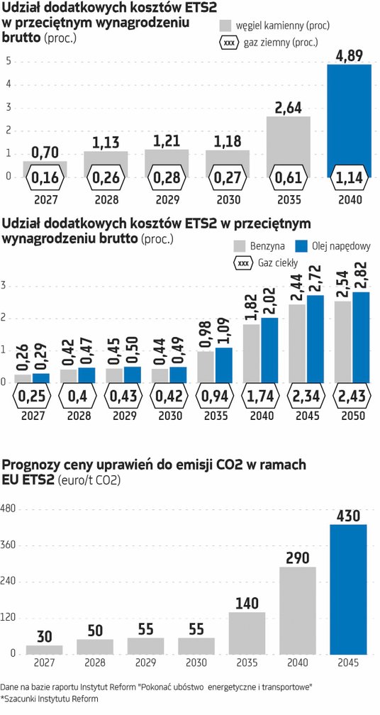 Chodzi o rozszerzenie tzw. systemu handlu uprawnieniami do emisji CO2, który od 2027 r. miałby objąć także gospodarstwa domowe, transport drogowy, a także mniejszy przemysł. Zgodnie z tym planem, przedsiębiorstwa sprzedające paliwa kopalne w tych sektorach będą musiały nabywać uprawnienia do emisji CO2. A to wprost przełoży się na wzrost kosztów ogrzewania np. domów jednorodzinnych oraz na ceny paliw. Według wyliczeń ekspertów banku ING, zakup uprawnienia do emisji jednej tony CO2 za ok. 45 euro przełoży się na wzrost ceny litra benzyny o 46 gr. i o 54 gr. za litr oleju napędowego. W przypadku kosztów ogrzewania węglem mogą one wzrosnąć – przy takiej samej cenie za uprawnienie – o 44 zł za MWh, a węgla nawet o 400 zł za tonę. I będą one rosły wraz ze wzrostem ceny uprawnień do emisji CO2 na rynkach, co ma zachęcić do redukcji emisji nie tylko przez duży przemysł i energetykę jak to jest obecnie (EU ETS 1), ale także te mniejsze podmioty.
