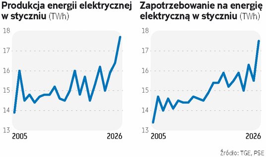 Tegoroczne zapotrzebowanie na energię w styczniu było rekordowe. Zużycie energii wyniosło wedle danych Polskich Sieci Elektroenergetycznych w pierwszym miesiącu tego roku 17,5 TWh. Takiego zużycia energii w styczniu jeszcze nie notowano. W 2024 r. wyniosło 16,3 TWh, a w 2025 r. 15,5 TWh.