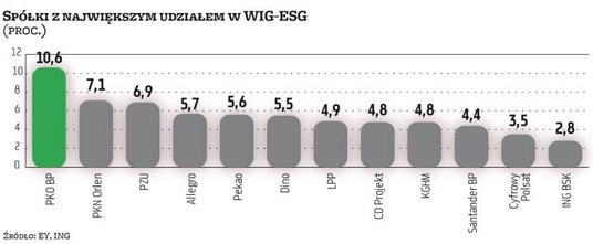 Obecnie w skład WIG-ESG wchodzi 60 spółek. Największy udział mają PKO BP, PKN Orlen i PZU. Ponad 5-proc. udział w portfelu wskaźnika mają jeszcze Allegro, Pekao i Dino. Swoje miejsce w indeksie znaleźli reprezentanci niemal wszystkich branż. Wspomniane wyżej firmy działają w branży finansowej, paliwowej i handlowej. W WIG-ESG znajdziemy też reprezentantów sektora gier (m.in. CD Projekt, PlayWay, Ten Square Games), świadczących usługi informatyczne (grupa Asseco, Comarch, LiveChat, DataWalk), działających w branży biotechnologicznej (Selvita, Biomed-Lublin, Mabion, OAT, Celon Pharma), przemysłowej (Grupa Kęty, Amica, Stalprodukt) czy telekomunikacyjnej (Orange Polska, Cyfrowy Polsat).