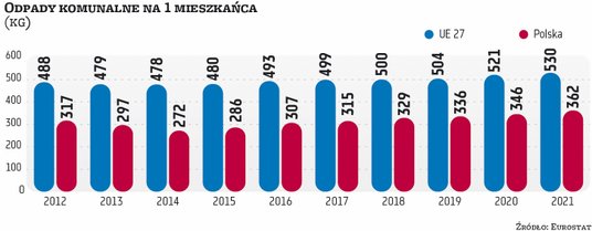 Na razie jednak unijne statystyki pokazują systematyczny (choć już nieco wolniejszy) wzrost ilości wytwarzanych w UE śmieci. Według ostatnich danych Eurostatu, w 2021 r. na każdego mieszkańca Unii przypadało 530 kilogramów odpadów komunalnych, o 42 kg więcej niż przed dekadą. (Ponad jedną trzecią odpadów stanowiły te po opakowaniach). W Polsce ilość odpadów komunalnych wzrosła w tym czasie o 45 kg do 362 kg na osobę. Co prawda daleko nam do unijnych rekordzistów – Luksemburga (793 kg), Danii (786 kg) czy Belgii (759 kg), ale gonimy unijną średnią.