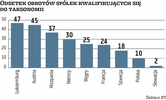 W sumie ponad jedna trzecia wszystkich analizowanych przez EY spółek nie zgłosiła żadnych kwalifikujących się do taksonomii obrotów, co w praktyce oznacza, że prowadzą działalność, która w żaden sposób nie przyczynia się do łagodzenia zmian klimatu. Średni odsetek kwalifikujących się do taksonomii obrotów w 17 badanych krajach wynosi prawie 25 proc. Polska, z 10 proc., jest w ogonie tego zestawienia. Dla porównania: w firmach niemieckich odsetek ten jest trzykrotnie wyższy, a w hiszpańskich ponad czterokrotnie. Wyprzedzają nas też mocno Węgry (25 proc.) czy Grecja (31 proc.). Jeszcze gorzej wypadamy pod względem obrotu już dostosowanego do taksonomii: przedsiębiorstwa z Polski raportują 4 proc. takich przychodów. To o 4,5 pkt proc. mniej niż średnia dla badanych krajów. Eksperci komentują, że głównym powodem tak niskiego udziału „zielonych” obrotów wśród rodzimych spółek jest m.in. ich struktura branżowa (np. reprezentanci górnictwa).
