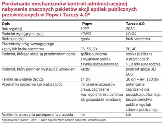 Projekt tarczy 4.0 przewiduje wprowadzenie do ustawy o kontroli niektórych inwestycji obowiązku zawiadomienia UOKiK o zamiarze nabycia albo nabyciu akcji reprezentujących 20 oraz 40 proc. głosów w spółkach publicznych (niezależnie od branży) oraz w podmiotach funkcjonujących w branżach strategicznych. Procedurze tej mieliby być poddani inwestorzy spoza UE/EOG, w odniesieniu do przedsiębiorców, których roczne przychody wynoszą powyżej 10 mln euro.