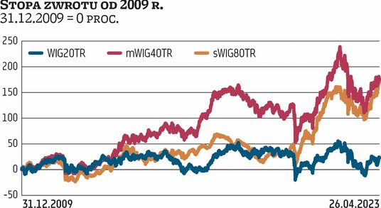 Ponieważ historia poziomów dochodowych wariantów indeksów mWIG40 i sWIG80 sięga 31 grudnia 2009 roku, a indeksu WIG20TR 31 grudnia 2004 roku, dla odpowiedniej porównywalności pomiędzy tymi indeksami warto posłużyć się wykresem obejmującym przedział czasu od 31 grudnia 2009 roku do momentu pisania tego materiału, czyli kwietnia 2023 roku.