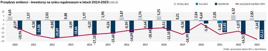 Analizą objąłem 368 emitentów krajowych w okresie ostatnich 14 lat. Spółki te wyemitowały w tym czasie nowe akcje (sens badawczy miała analiza środków, jakie przepływają pomiędzy inwestorami a spółkami, a nie pomiędzy poszczególnymi inwestorami) o wartości ponad 38 mld zł. Z drugiej strony skupiły one akcje własne za blisko 11 mld zł. A z trzeciej wypłaciły dywidendy w kwocie prawie 208 mld zł. Oznacza to, że w tym okresie emitenci netto oddali inwestorom ponad 180 mld zł. Szczegółowe dane zaprezentowane zostały na wykresie.
