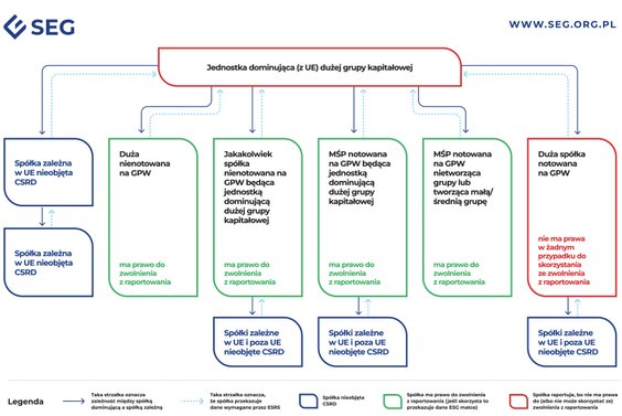 Najprostszy z nich, zamieszczony w niniejszym tekście (pozostałe schematy opublikowane są na stronie internetowej SEG-u) przedstawia spółki zobowiązane do raportowania bezpośredniego (zaznaczone na czerwono i zielono), przy czym tylko te zaznaczone na zielono mogą skorzystać ze zwolnienia, jeśli spółka wyższego szczebla z UE/EOG obejmie je raportem sporządzonym zgodnie z ESRS oraz spółki zależne objęte pośrednio CSRD, bo zobowiązane do przekazywania danych swoim matkom (zaznaczone na niebiesko).