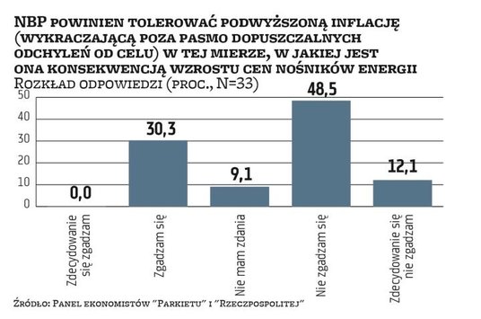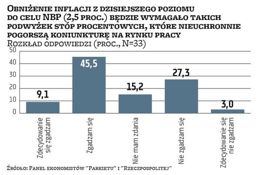 Z tezą, że „obniżenie inflacji z dzisiejszego poziomu do celu NBP (2,5 proc.) będzie wymagało takich podwyżek stóp procentowych, które nieuchronnie pogorszą koniunkturę na rynku pracy", zgodziło się (w tym zdecydowanie) 18 spośród 33 uczestników (czyli 55 proc.) tej rundy panelu. Przeciwnego zdania było dziesięciu respondentów (30 proc.). – Redukcja inflacji mogłaby się dokonać przy stosunkowo niskim koszcie, gdyby bank centralny był w stanie wiarygodnie zobowiązać się do prowadzenia polityki niskiej inflacji. W takim przypadku redukcji uległyby oczekiwania inflacyjne. W obecnej sytuacji, biorąc pod uwagę znacznie spóźnione działania NBP i ich nieprzemyślaną komunikację społeczeństwu przez prezesa banku, trudno jest jednak zakładać, aby NBP cieszył się dużą wiarygodnością antyinflacyjną. W związku z tym pozostaje drugi sposób redukcji inflacji, tj. schłodzenie gospodarki przez redukcję popytu zagregowanego – tłumaczy dr hab. Marek Dąbrowski z Uniwersytetu Ekonomicznego w Krakowie. Na deficyt wiarygodności obecnej RPP, który podnosi społeczne koszty walki z inflacją, wskazuje też były członek tego gremium prof. Andrzej Rzońca ze Szkoły Głównej Handlowej. – Wiarygodny bank centralny mógłby obniżyć inflację bez silnych podwyżek stóp procentowych. Na łączny popyt oddziałują realne stopy procentowe. Ich wzrost może się dokonać za sprawą podwyżek nominalnych stóp lub na skutek obniżenia oczekiwań inflacyjnych. Ale bank centralny, który ma deficyt wiarygodności, nie jest w stanie obniżyć oczekiwań inflacyjnych bez silnych podwyżek stóp procentowych i schłodzenia gospodarki – argumentuje.