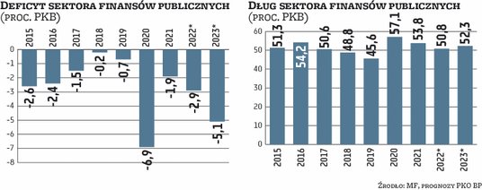 – Spodziewamy się, że deficyt całego sektora wzrośnie z ok. 4,5 proc. PKB w 2022 do ok. 7 proc. PKB w 2023 r. – mówi nam Adam Antoniak z ING Banku Śląskiego. – W 2022 r. deficyt general government będzie się kształtował na umiarkowanym poziomie poniżej 3 proc. PKB w br., ale w 2023 r. wyraźnie się zwiększy, według naszych prognoz do 5,1 proc. PKB – szacują ekonomiści PKO BP w najnowszych prognozach przedstawionych w środę.