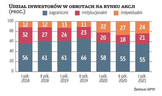 Główną siłą naszego rynku pozostają inwestorzy zagraniczni, którzy w I półroczu wygenerowali 55 proc. obrotów. W analogicznym okresie rok wcześniej było to 58 proc., a w II połowie 2020 r. 55 proc. Inwestorzy instytucjonalni w okresie od stycznia do końca czerwca odpowiadali z kolei za 21 proc. handlu. Jest to ich najwyższy udział w handlu od wybuchu pandemii.