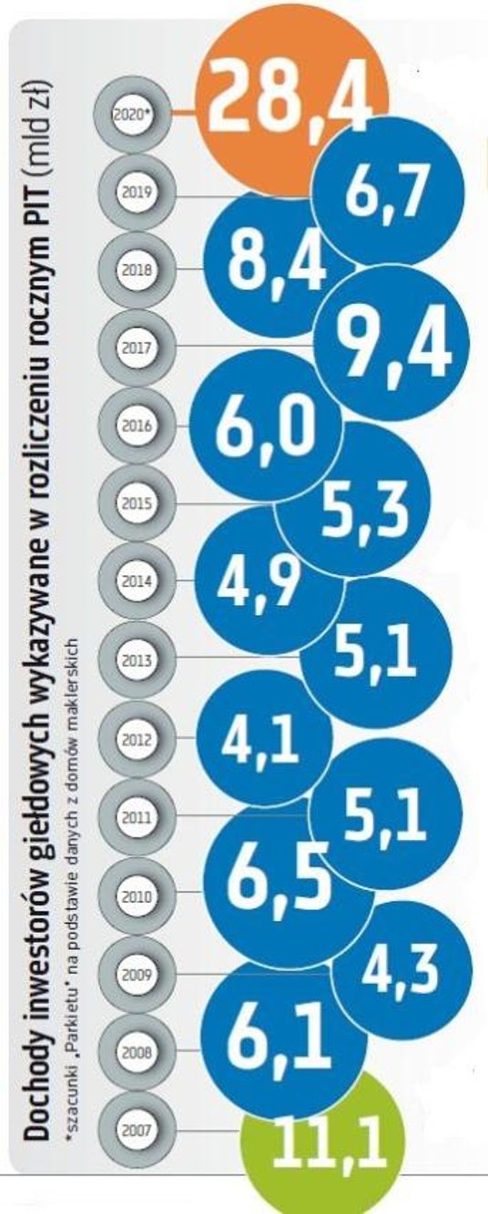 Z aktywności giełdowej w 2020 r. będzie się musiało rozliczyć 401 tys. inwestorów. To z kolei oznacza, że zysk na inwestora mógł wynieść nawet ponad 70 tys. zł.