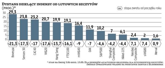 Warszawska „trójca" wygląda na globalnym tle nieźle. Od marcowego dołka do środowego popołudnia WIG20 i sWIG80 zyskały już po 42 proc., a mWIG40 33 proc. Od lutowych szczytów indeksy dzieli odpowiednio 20,7 proc., 2 proc. oraz 16,4 proc. Segment maluchów jest najsilniejszy, o czym świadczy m.in. fakt, że jako jedyny z tej trójki ma dodatnią stopę zwrotu od początku roku, 7,1 proc., i jest powyżej średniej kroczącej z 200 sesji i 61,8-proc. zniesienia Fibonacciego. Na wykresie sWIG80 tworzy się duża formacja V, więc atak szczytowy to kwestia najbliższych sesji.