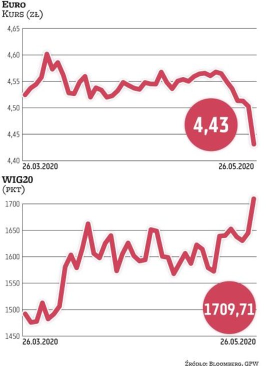 W ocenie specjalistów motorem zwyżek jest właśnie powrót optymizmu na globalne rynki. I nawet jeśli oczekiwania inwestorów na V-kształtne ożywienie gospodarcze okażą się nieuzasadnione, to kurs euro w złotym nie powinien już wrócić powyżej 4,50 zł. Udana wtorkowa sesja na GPW jest też zaproszeniem do zakupów akcji.