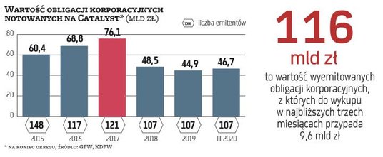 – Zgodnie z danymi prowadzonego przez KDPW Rejestru Zobowiązań Emitentów wartość uplasowanych obligacji wynosi teraz 116,4 mld zł, a wartość wykupów w najbliższych trzech miesiącach to ok. 9,6 mld zł. Ale rejestr jest jeszcze niepełny – spółki i podmioty prowadzące ewidencje obligacji są zobowiązane zaraportować dane o wszystkich emisjach do końca marca tego roku. Mimo niepełności danych pokazują one, z jaką skalą wykupów przyjdzie się zmierzyć emitentom w najbliższym czasie – mówi Mateusz Mucha, menedżer w Navigator DM.