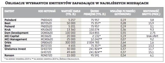 Równie trudno odpowiedzieć dziś na pytanie o przyszłą kondycję firm windykacyjnych. Na koniec roku Kruk dysponował kwotą 150 mln zł środków pieniężnych i legitymował się także napływami rzędu 450 mln zł kwartalnie. Styczeń i luty nie przyniosły tu żadnych zmian (również na rynkach zagranicznych), dopiero marzec i drugi kwartał mogą rozczarować (ale tego dziś nie wiemy). Tymczasem Best w 2020 r. dopiero wchodzi w okres zwiększonych wykupów obligacji, a zobowiązania Kruka związane z zapadającymi papierami to 94 mln zł (przy spółce o takiej skali działania to bardzo mało). Mimo to czerwcowa emisja Kruka oferuje ponad 9 proc. rentowności (liczonej – tak jak dla pozostałych przykładów – według najlepszej dostępnej ceny sprzedaży). W przypadku Bestu ryzyko jest nieco wyższe (Best wykupił w marcu dwie serie obligacji) i rentowność jest dwucyfrowa.