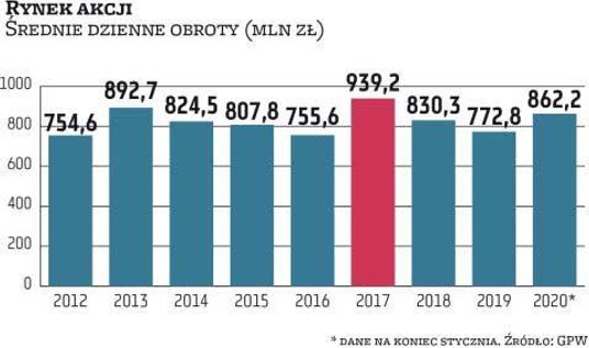 W ostatnich dniach na warszawskim parkiecie zapanował większy ruch. Obroty akcjami na sesję znów zaczęły przekraczać 900 mln zł, a nie brakowało także dni, kiedy osiągały ponad 1 mld zł. To miła odmiana w stosunku do tego, co się działo w ubiegłym roku. W całym 2019 r. średnie dzienne obroty na rynku akcji wyniosły bowiem 772 mln zł.