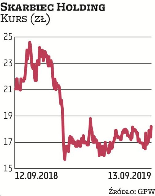 Przychody Skarbca Holdingu za rok obrotowy 2018/2019 wyniosły 112,9 mln zł w porównaniu z 101,5 mln zł w roku obrotowym 2017/2018. Zysk netto sięgnął zaś 31,17 mln zł w porównaniu z 19,6 mln zł. DM mBanku szacował wyniki na odpowiednio 105,1 oraz 24 mln zł, a Santander prognozował 109,5 mln zł przychodów i 29,9 mln zł zysku netto. I półrocze 2019 r. (II półrocze roku obrotowego w Skarbcu) było bardzo udane dla funduszy akcji zagranicznych tego TFI. Stąd przychody z opłaty zmiennej wzrosły o blisko 59 proc. i wyniosły 33,2 mln zł (wobec 15,2 mln zł w poprzednim roku obrotowym). Z opłaty stałej spółka pobrała 78,3 mln zł wobec 80,9 mln zł przed rokiem. „Spadek średnich aktywów pod zarządzaniem wpłynął na zmniejszenie wynagrodzenia stałego za zarządzanie" – tłumaczy TFI. Ten rok jest dla TFI ciężki, jeśli chodzi o saldo sprzedaży funduszy. Mimo dobrych stóp zwrotu od początku 2019 r. do końca sierpnia aktywa pod zarządzaniem Skarbca TFI spadły aż o 18 proc., do 3,58 mld zł. Odpływy odbijają się na notowaniach. Co prawda w piątek po południu akcje firmy zwyżkowały o 5 proc., do 18,3 zł, ale od początku roku zniżka jest dwucyfrowa.