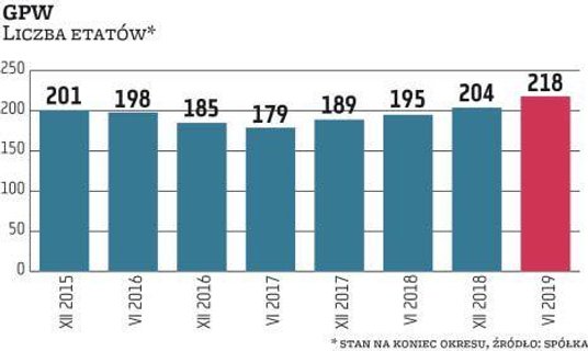 Na koniec czerwca było ich 218, co oznacza, że poziom zatrudnienia na GPW jest najwyższy co najmniej od momentu, kiedy giełda stała się spółką publiczną (w 2010 r.) i ma obowiązek publikacji tego typu danych.