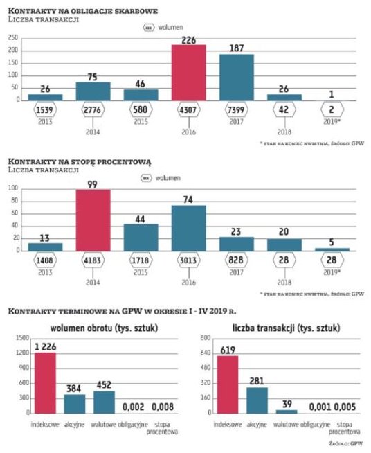 Podchody do kontraktów na obligacje GPW robiła już w 2005 r. Próba ta jednak skończyła się niepowodzeniem. Z racji braku zainteresowania tymi instrumentami giełda wycofała je z obrotu po dwóch latach. Po kilku latach wróciła jednak do tych instrumentów, ale na razie wszystko wskazuje na to, że i ten ruch skończy się fiaskiem. W całym 2013 r. obrócono zaledwie 13 kontraktami na stopę procentową i 26 pochodnymi na obligacje skarbowe. W 2014 r. sytuacja wygląda już nieco lepiej, ale i tak była daleka od ideału. Liczba transakcji kontraktami na stopę procentową wyniosła 99. Do tego dochodzi także 75 transakcji na kontraktach na obligacje. Kolejne lata nie przyniosły przełomu. W tym roku można już nawet mówić o śmierci tego rynku. W ciągu czterech miesięcy na rynku kontraktów na obligacje dokonano zaledwie jednej transakcji, zaś na rynku pochodnych na stopę procentową zawarto tylko pięć transakcji.