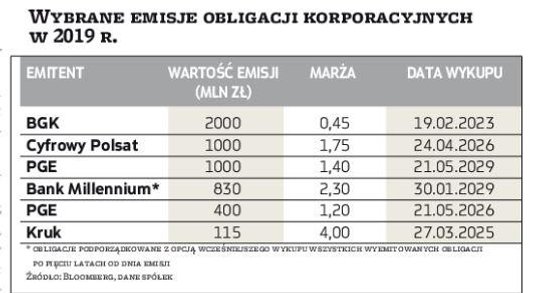 Początek roku był dość ubogi, jeśli chodzi o emisje papierów korporacyjnych. Największą ofertą były papiery sprzedawane przez Bank Gospodarstwa Krajowego w kwocie 2 mld zł oraz obligacje podporządkowane Banku Millennium warte 830 mln zł. Drugi kwartał rozpoczął się za to znacznie lepiej. Po Wielkanocy Cyfrowy Polsat zamknął emisję siedmioletnich papierów o wartości 1 mld zł. Dług tej firmy wymagalny w 2026 r. jest oprocentowany 0,75 pkt proc. niżej niż poprzednie papiery telekomunikacyjnej spółki. Dzięki refinansowaniu starszej serii koszty odsetkowe spadną o 7,5 mln zł rocznie.