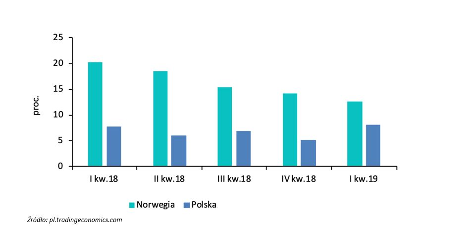 Spada stopa bezrobocia. Na początku 2019 r. wynosiła 3,8 proc. Bezrobocie rejestrowane w lutym 2019 r. było na najniższym poziomie od 10 lat (2,5 proc.). Rząd Norwegii przewiduje, że wzrost gospodarczy będzie wyższy niż prognozy zarówno w 2019, jak i w 2020 r.