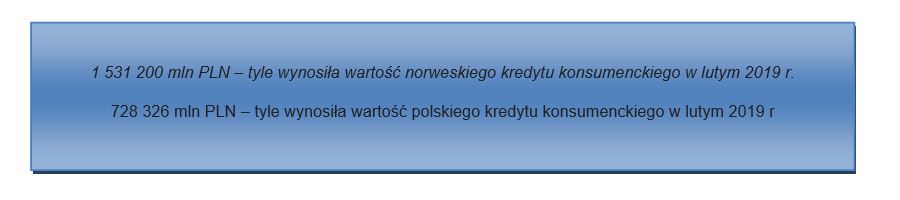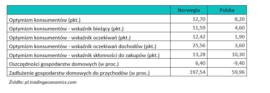 Zaufanie konsumentów w Norwegii w pierwszym kwartale 2019 r. wyniosło 12,7 pkt (w Polsce 8,2 pkt). Wskaźnik ten obrazuje, ile pieniędzy w danym momencie konsumenci są w stanie wydać na dobra i usługi. Zaufanie konsumentów się zwiększa wraz ze spadkiem bezrobocia i wzrostem PKB. Przy dobrej koniunkturze gospodarczej konsumenci chętnie sięgają po kredyty.