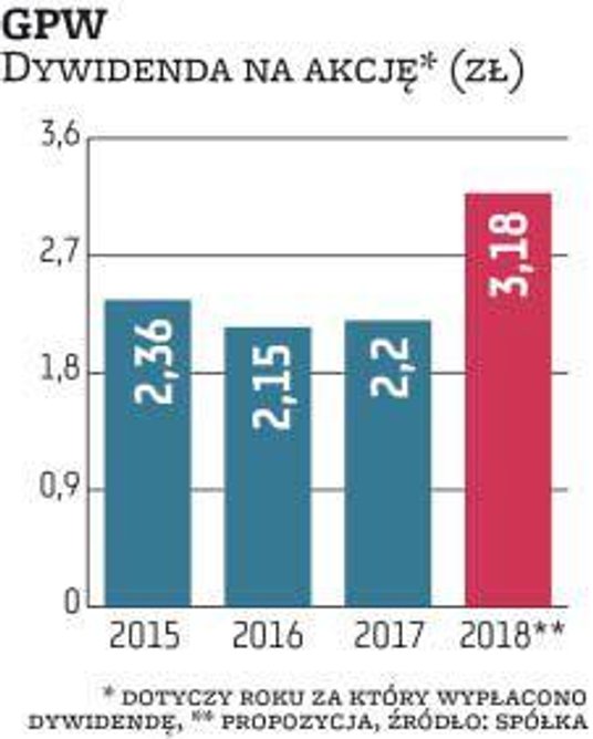 Powodów do wzmożonego zainteresowania walorami operatora było co najmniej kilka, jednak uwaga inwestorów skupiła się przede wszystkim na dywidendzie. GPW chce z zysku wypracowanego w 2018 r. wypłacić 3,18 zł dywidendy na akcje (rok wcześniej było to 2,2 zł). Biorąc pod uwagę piątkową cenę zamknięcia, dawało to stopę dywidendy na poziomie 8,15 proc. Jednocześnie GPW na nowo zdefiniowała politykę dzielenia się zyskiem z akcjonariuszami w kolejnych latach.