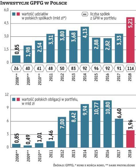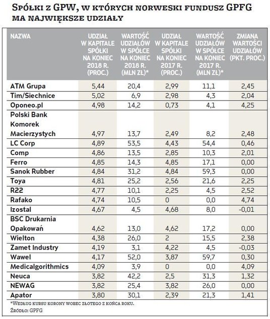 W portfelu Rządowego Globalnego Funduszu Emerytalnego Norwegii (GPFG), który zarządza aktywami o wartości 8,3 bln koron norweskich (3,6 bln zł), na koniec 2018 r. znajdowały się akcje 114 spółek z GPW. Łącznie były one warte blisko 12,1 mld koron (5,2 mld zł po kursie z końca ub.r.). Rok wcześniej GPFG był w akcjonariacie 91 polskich firm, a rynkowa wartość tych pozycji wynosiła niespełna 7,9 mld koron (3,3 mld zł). W ciągu roku zaangażowanie norweskiego giganta na polskim rynku akcji zwiększyło się więc o 53 proc., licząc w koronach, i o 57 proc., licząc w złotych. Te liczby robią wrażenie szczególnie w kontekście słabej w ub.r. koniunktury na GPW: WIG20 zniżkował w 2018 r. o 7,5 proc. A dodatkowo złoty osłabił się wobec korony. To oznacza, że Norwegowie zainwestowali dużo świeżego kapitału.