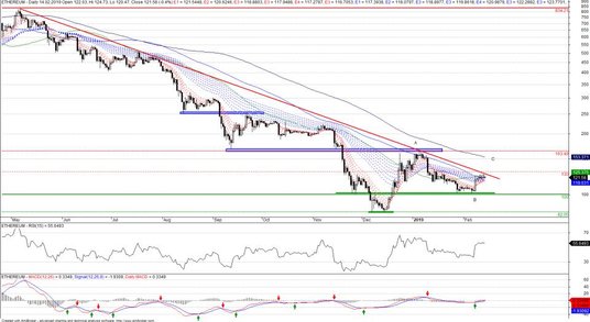 Podejście pod linię trendu spadkowego, po udanej obronie strefy 100 USD, zachęca do jej zaatakowania w celu wybicia i wygenerowania triggera do wyprowadzenia drugiej podfali wzrostowej w ramach średnioterminowej korekty A-B-C. Wprawdzie za wcześnie jest na to, aby przyjąć założenie o powstaniu korekcyjnego zygzaka tym bardziej, że grudniowa zwyżka zawiera w sobie elementy trójfalowe, jednakże w przypadku wybicia w cenach close strefy 130 USD pojawi się pretekst do wdrapania się kryptowaluty 20 proc. wyżej. W średnim jak i długim terminie nadal jednak obowiązuje układ bessy, którego zanegowanie będzie możliwe dopiero w przypadku trwałego wydostania się nad strefę 165 USD.
