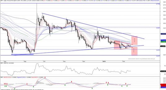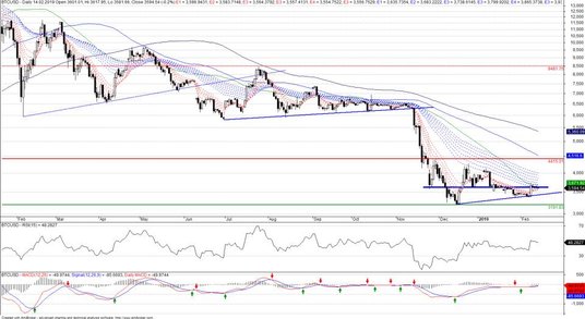 Podbicie z ubiegłego piątku nie doprowadziło do większych zmian zarówno w ujęciu krótkoterminowym jak i średnioterminowym. Lokalne pojawienie się białej świeczki nie zachęciło do wyprowadzenia wzrostowej kontry, przez co kluczowe opory pozostały nienaruszone. To co zwraca na siebie uwagę to podejście cen pod średnią z 55 sesji, która wraz z MA89 oraz MA144 nadal wyznaczają kierunek dla kryptowaluty. W okolicy 3600 USD znajduje się strefa podażowa bazująca na listopadowo-grudniowych ekstremach, co z punktu widzenia Price Action działa negatywnie na ewentualną aprecjację bitcoina. Biorąc jednak pod uwagę dotychczasowe średnioterminowe korekty - płaskie struktury wydłużone w czasie o trójkątnych kształtach - nie można wykluczyć, że tego typu korekcyjny twór ponownie pojawi się na wykresie jako forma przeczekania przed dalszymi spadkami w długim terminie.