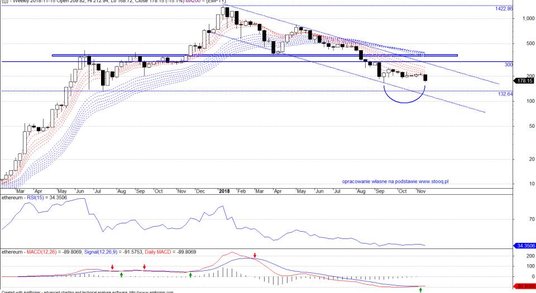 Zagranie na podwójne dno z możliwością korekty wzrostowej w trendzie spadkowym – takie szybkie wnioski płyną z dziennego wykresu ethereum. Pytanie tylko, czy silniejszym czynnikiem nie okaże się wsparcie przy poziomie 132 USD, które wciąż ściąga do siebie kurs. Na wykresie tygodniowym nie pojawiła się jeszcze żadna, popytowa formacja negująca długoterminowy sygnał SELL, co negatywnie wpływa na ocenę techniczną kryptowaluty. Od połowy września trwa próba szarpnięcia kursu na północ, lecz przez ostatnie trzy miesiące stronie popytowej nie udało się nawet podejść pod lokalny opór 300 USD. Poziom ten ma nie tylko psychologiczny wydźwięk, lecz jest związany z wrześniową świeczką o okazałym, czarnym korpusie, która zepchnęła notowania na roczne minima. Aby outlook na ethereum miałby się poprawić, poziom ten musiałby zostać wybity w tygodniowych cenach close, a do tej wysokości Big Picture jest na korzyść baribali.